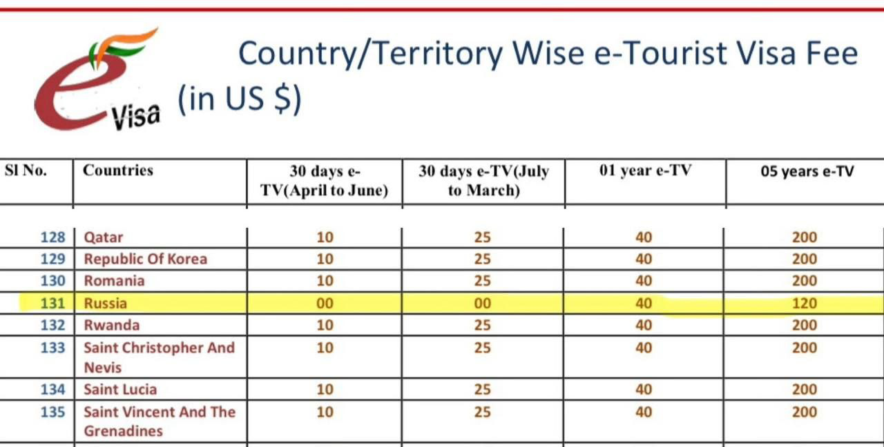 С января 2026 года электронные 30-дневные визы в Индию для граждан РФ стали бесплатными Стоимость визы на год — 40 долларов, а на 5 лет — 120 долларов. Также Индия увеличила срок действия электронной визы для туристов до 120 дней, но по-прежнему можно находиться в стране не более 30 дней. Несмотря на отмену сбора за электронную визу на 30 дней, её нужно оформить заранее независимо от срока поездки.
