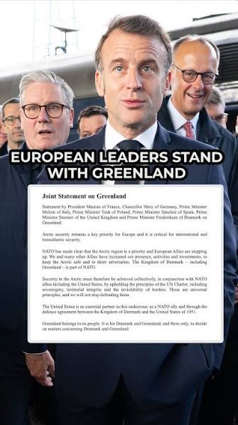 Лидеры ключевых стран Европы выступили с единым заявлением по ситуации вокруг Гренландии Документ подписали руководители Франции, Германии, Италии, Испании, Великобритании и Дании. Они подчеркнули, что вопросы безопасности в Арктике должны решаться совместно в рамках НАТО, с полным соблюдением суверенитета и территориальной целостности. Отдельно подчеркнуто, что Гренландия — территория её народа, и любые решения, затрагивающие Данию и Гренландию, должны приниматься только ими. Лидеры ключевых стран Европы выступили с единым заявлением по ситуации вокруг Гренландии Документ подписали руководители Франции, Германии, Италии, Испании, Великобритании и Дании. Они подчеркнули, что вопросы безопасности в Арктике должны решаться совместно в рамках НАТО, с полным соблюдением суверенитета и территориальной целостности. Отдельно подчеркнуто, что Гренландия — территория её народа, и любые решения, затрагивающие Данию и Гренландию, должны приниматься только ими.