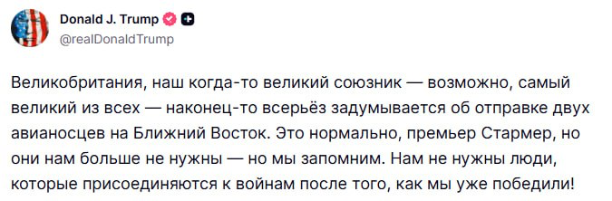«Нам не нужны люди, которые присоединяются к войнам после того, как мы уже победили» — Трамп. Президент США прокомментировал намерения Великобритании направить на Ближний Восток два авианосца и отказался от помощи. @bloombusiness