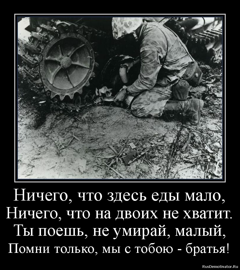 Ничего, что здесь еды мало, Ничего, что на двоих не хватит. Ты поешь, не умирай, малый, Помни только, мы с тобою братья!