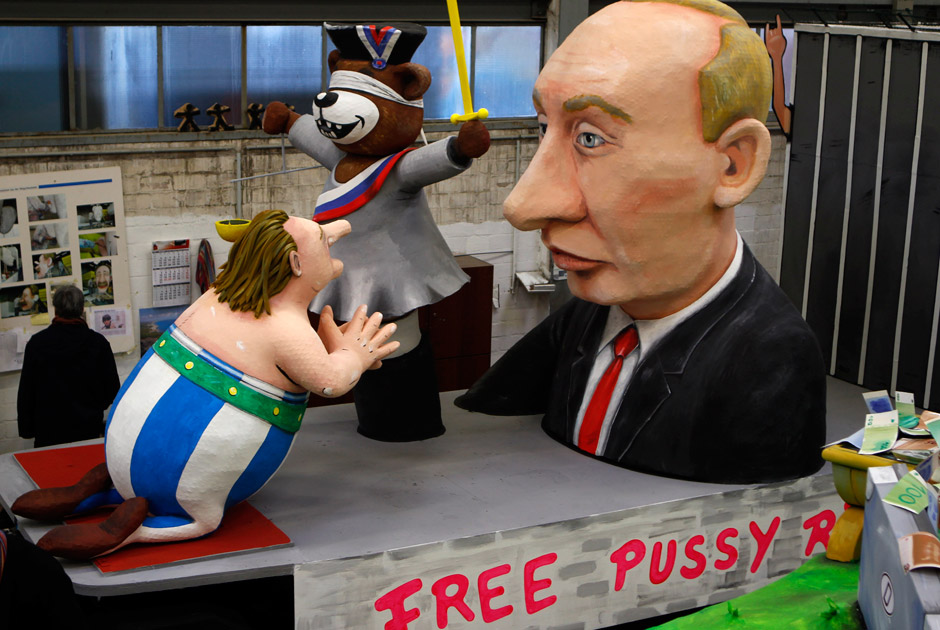 Платформа с куклами, изображающими Владимира Путина и Жерара Депардье в образе Обеликса, на карнавале в Кельне, Германия