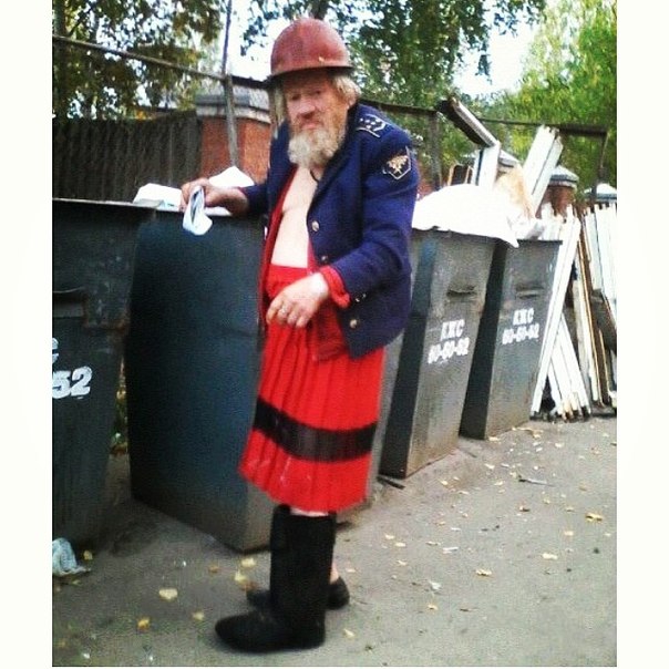 Photo Information for Автор фото считает, что этот бомж в красной юбке, которого мы видим на фото, это типичное явление современной России. Он ряженый. Он фрик.