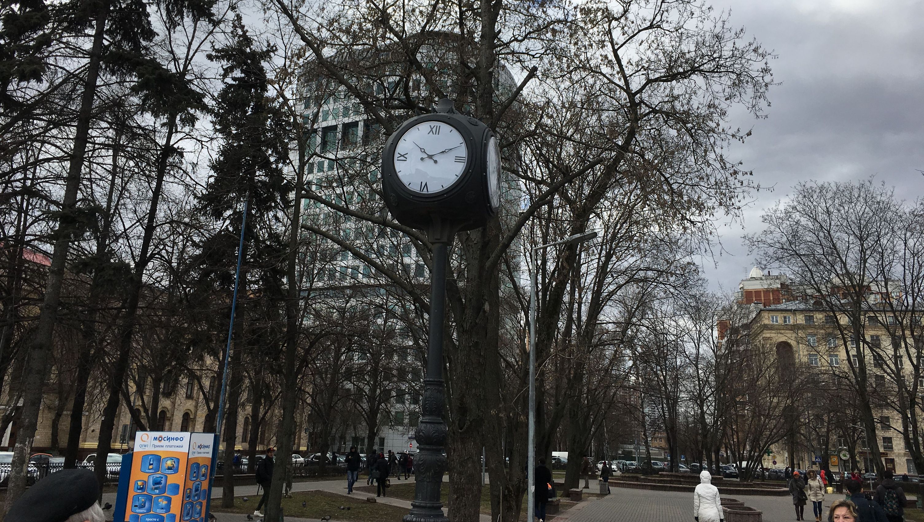 Часы в парке у перекрестка улицы Викторенко и Ленинградского проспекта (дублёра) в входа в метро 'Аэропорт', Москва 20.04.2017